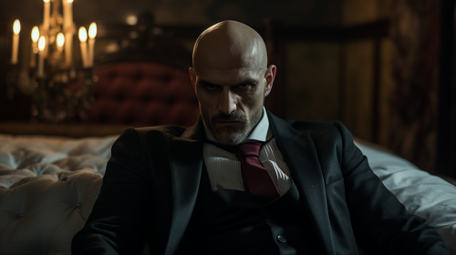 digital art of young extremely handsome male vampire, red eyes, hair red brown, very elegant brown suit