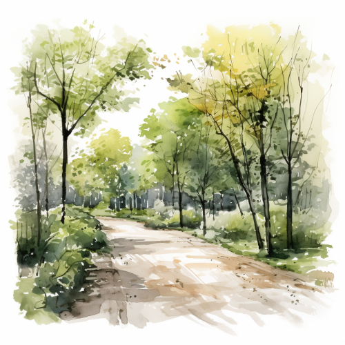 quick minimalist watercolor sketch, expressive, dense overgrown old park in Stamford, in October, dark grey-beige tones with dark green and blue accents, isolated on white background