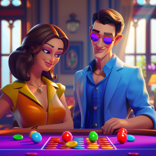 Cool man and beautiful woman are playing the board game that looks like a match-3 candy computer game one against the other. The game is for money. Casino environment. Cartoon detailed 3D style. --ar 1:1 --v 6.0