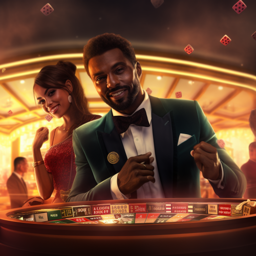 Photorealistic, two people at a roulette table in a casino, one who is betting on the table looking sad, one who is holding a bar of gold behind him looking happy