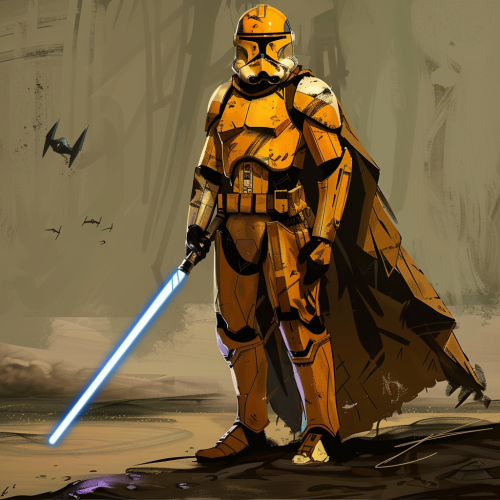 Painting of a Wookie Jedi with brown hair, brown eyes, confident, wielding a yellow lightsaber, fighting a sith on the battlefield, epic pose, majestic pose, extremely detailed, Alex Ross artwork style --ar 16:9 --v 6.0