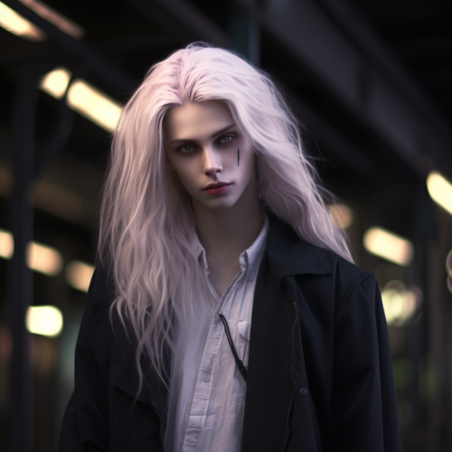 beautiful, ethereal, feminine, androgynous male, long straight pure white hair, pink eyes, albino, pale skin, heavy eyeliner, dark eyebrows, dark clothing, pointed ears, hyper realistic, realism, photo realistic, modern day, downtown city at night, evil smile, smirking, villainous --v 5.2