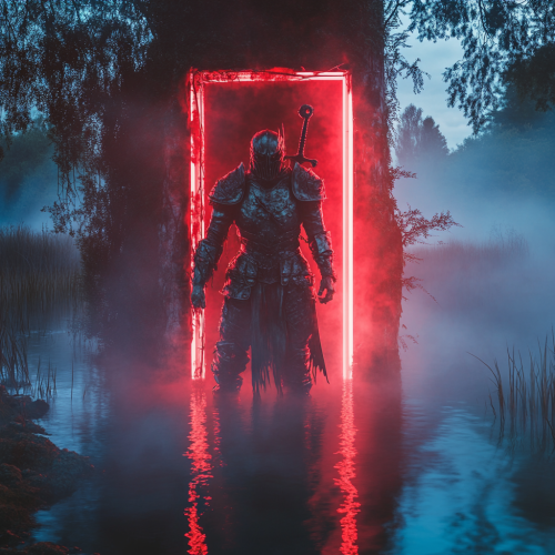 A full body photograph of an undead knight with torn armor, in the style of horror fantasy, Photo realistic, misty lake, neon red glow from a portal door on the side. --style raw