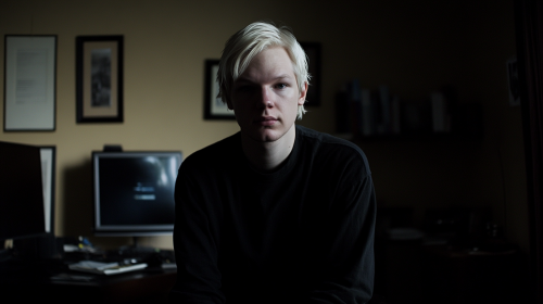 Centered of a young Julian Assange sitting in the shadows and looking into the camera. In the style of David Fincher. Dark, moody, atmospheric, cinematic. 35mm filmstock. --ar 16:9