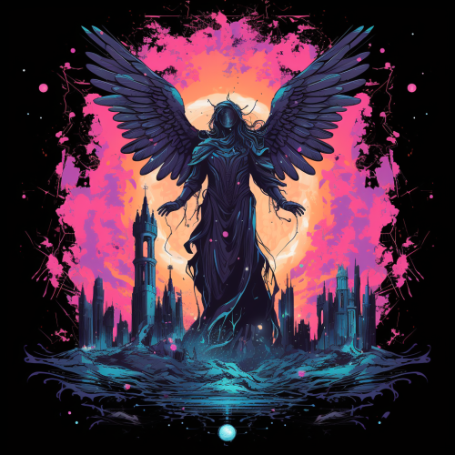 gothic stone angel statue deep in a space nebula city, ephemeral and holy, nebula galaxy stars, bright pink blue and orange light, 2d vector, in the style of studio ghibli