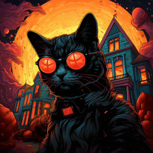 8K. An EDM style black cat wearing sunglasses in front of a haunted house. Pumpkins all around. Lots of colors. Edgar Allan Poe Style.