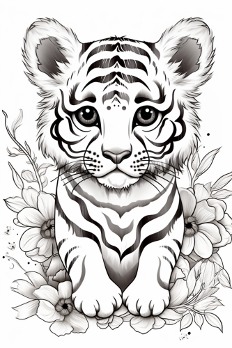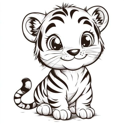 Create a friendly, adorable, chubby TIGER character with a smiling face, outline art, coloring page outline page with white background, sketch style, only use outline, cartoon style, clean and clear and well outlined. Ensure the character has a smooth and inviting appearance. Keep the design minimalistic for easy coloring. The goal is to make it appealing and approachable for children aged 2 to 4 in the middle of their artistic journey, make it black and white --s 250