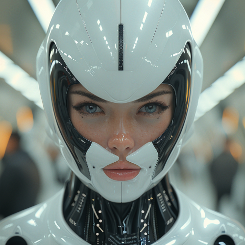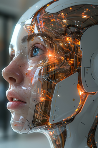 a futuristic robot girl looking at the camera in a futuristic space, in the style of hyperrealism and photorealism, anatoly metlan, dark silver and light bronze, her face has metallic and translucent parts, 32k uhd, vik muniz, elegant and emotive faces, symmetrical, the shot focuses on her whole head and part of her shoulders, depth of field background --ar 2:3 --s 750
