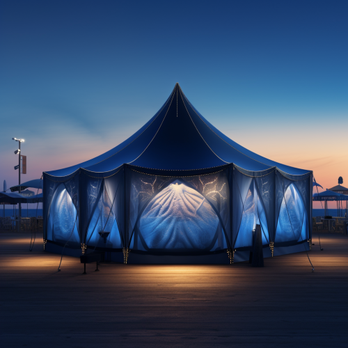 dark blue tent of the fortuneteller on fair in Los Angeles, transparent/translucent medium, smooth and shiny, high definition, summertime, sunset, california, cinematic mood, ultrarealistic, photorealistic --style raw