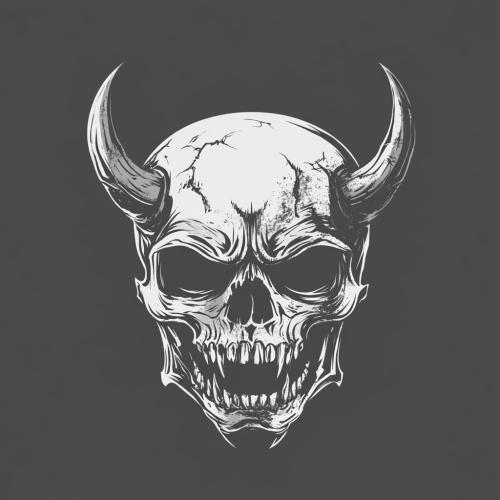 Dark skull with horns, barbed wire, grunge tattoo style.