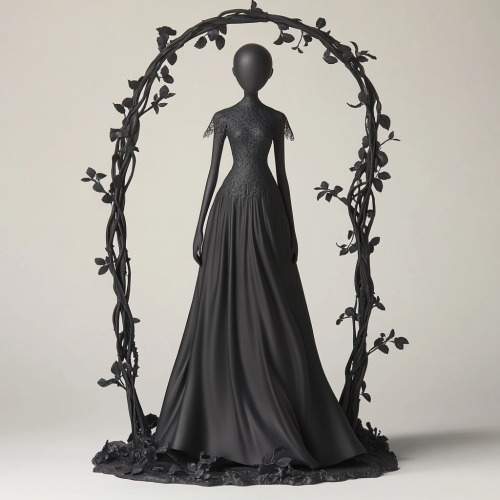 Create a 9-head-tall soft vinyl (sofubi) figure, distinct from a Barbie doll, inspired by the elegant, melancholic illustration of a figure standing under a vine-covered archway. The figure should embody grace and mystery, capturing the essence of solitude and nostalgia. Design the doll with elongated proportions, emphasizing a flowing silhouette. The vinyl figure's gown should replicate the intricate drape and subtle patterns of the original illustration, with delicate textures incorporated directly into the vinyl material to mimic lace and floral embroidery. The dress flows down to the base like a trailing shadow, evoking timeless elegance. The figure should have a faceless or minimalist expression, reinforcing the sense of anonymity and introspection. Sculpt the hands delicately, as if the figure is lost in thought or contemplation, with slightly bent fingers. For the background elements, surround the figure with a soft vinyl arch, entwined with sculpted vines and leaves. These vines and ivy, cast directly into the vinyl, emphasize the theme of nature reclaiming forgotten spaces. Use muted, aged tones--such as faded greens and soft grays--for the plants, complementing the figure’s dark attire. Place the figure in a subtle, cracked base, as if standing on an ancient stone floor, with small vinyl butterflies or leaves scattered around to enhance the sense of fleeting time. Ensure the vinyl material has a matte finish, creating an ethereal and nostalgic aesthetic that bridges both elegance and abandonment.