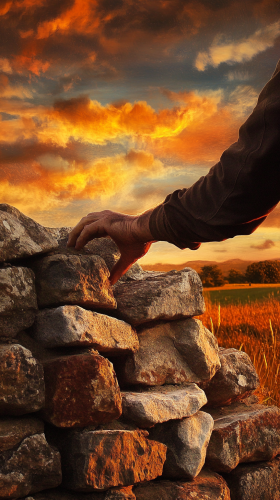 A man building a wall, hands gripping stones as they’re carefully placed Mood: Focus, dedication, craftsmanship Style: Vincent Van Gogh, Perspective: medium close, late afternoon, Colors: Warm oranges, earthy browns, dark reds in the stonework, Background: A countryside field stretching beyond the wall, swirling skies transitioning from deep blue to sunset orange. --ar 9:16