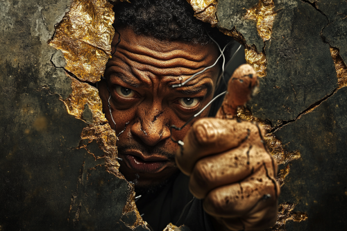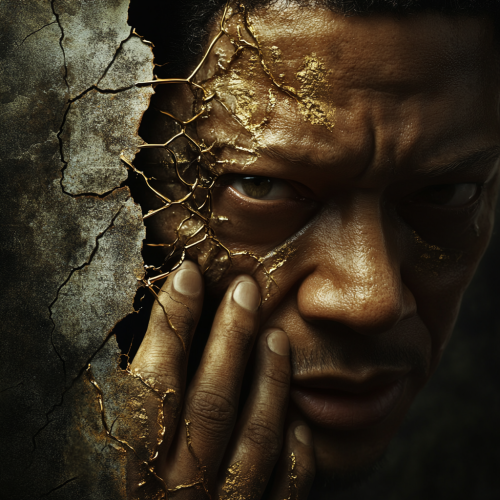 Terrence Howard punching through a wall, skin is cracking like stone and some cracks have gold paint kintsugi, wires and metal and glass shards are sticking out of the cracks, depth of field, hyper detailed, sharp focus, highly detailed, ultra realistic texture --ar 3:2 --v 6.1