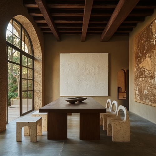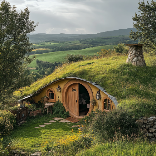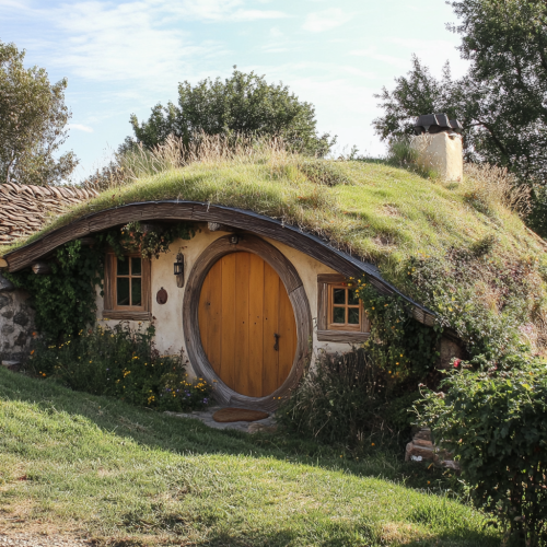 Vue d'ensemble d'une maison de style hobbit avec un toit végétalisé intégré à une restanque plane de 20 mètres de longueur, située à 1 mètre du sol. Le toit commence à hauteur de la restanque et s'étend sur 5 mètres, créant une légère courbure visible sur toute la longueur de la restanque. Le mur arrière de la maison est en pierre sèche, tandis que la façade avant comporte une porte rectangulaire en bois et une fenêtre. La structure de la charpente, y compris la ferme visible en bois, doit être bien mise en avant. Montrer la restanque entière ainsi que la courbe du toit végétalisé, avec des détails réalistes, des textures de pierres sèches, et des effets photographiques avec contraste et ombres portées. L'ambiance générale doit évoquer un film tourné en Techniscope, avec une esthétique cinématographique vintage et des couleurs légèrement désaturées