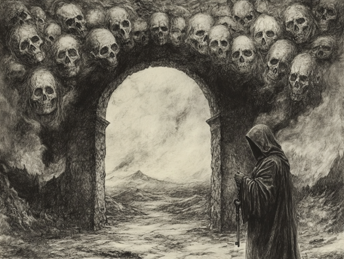 Charcoal drawing of a hooded figure holding a key, stood in front of an archway of solid black, surrounded by moorland. The sky is made up of faces of angels and demons. --ar 4:3