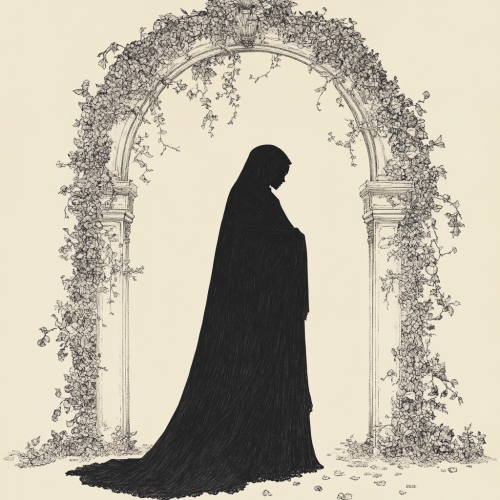 Create a surreal and elegant illustration in the style of Edward Gorey, featuring a solitary figure in a flowing black gown standing beneath an ornate floral archway. Use detailed cross-hatching to convey the texture of the gown and subtle shadows on the floral elements. The figure’s expression should be calm and distant, evoking an eerie sense of detachment and mystery. Simplify the background, using negative space effectively to emphasize isolation, yet include delicate details such as arched doorways and soft floral motifs to hint at hidden meaning. Add symbolic elements--perhaps scattered petals or faint cracks in the floor--suggesting fleeting beauty or suppressed emotions. Maintain fine lines and intricate textures to create a world that feels elegant yet melancholic, in keeping with Gorey’s signature surreal and haunting atmosphere.