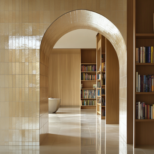 modern, sleek archway with one side entirely covered in smooth, glossy ceramic tiles. The tiles are uniform in size, light-colored, and create a polished, reflective surface that contrasts with the warm wood of the bookshelf on the opposite side. The tile pattern follows the curve of the arch seamlessly, enhancing the clean lines and contemporary feel. The grout is minimal, and dark, outlining sleek texture and elegant finish. The tiled side catches natural light