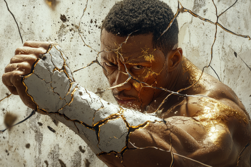 Terrence Howard punching his hand through a wall, skin is cracking like stone and some cracks have gold paint kintsugi, wires and metal and glass shards are sticking out of the cracks, depth of field, hyper detailed, sharp focus, highly detailed, ultra realistic texture --ar 3:2 --v 6.1