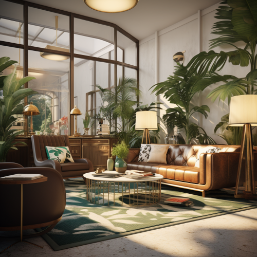ultra detailed realistic 3D cinematic render - informal meeting area, midcentury modern furniture, sofas, arm chairs, coffee tables, lamps, planting, magazines on tables, art deco archway decals on walls, window behind sofa back wall