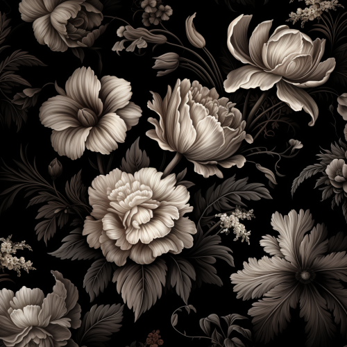 surreal dark victorian floral pattern ultra detailed with all black flowers in the style of dutch master florals