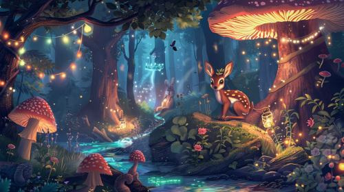 A magical forest scene with oversized, colorful mushrooms, playful animals peeking out from behind trees, and winding paths. Designated circular areas for stickers, surrounded by flowers and sparkling lights