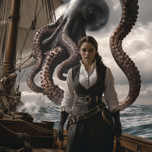 Photorealistic image of the front view of a short Caucasian white woman with dark hair wearing clothing befitting a captain standing on the deck of her sailing ship. Behind her, a single giant tentacle rises above the ocean and is landing on the deck.