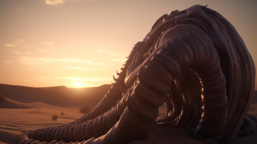 Screengrab from a ridley scott film of an H. R. Giger inspired alien tentacle, single tentacle in frame, detailed ribbed skin, desert in the background, photorealistic, side shot, sunset background, photography, photorealistic, 4K resolution, high detail --ar 16:9 --v 5.0