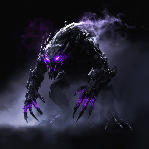 A dark, shadowy figure that shifts its shape, with glowing purple eyes and smoke constantly billowing around it. Grimlock can form into different shadowy animals or take a more monstrous shape with long, sharp claws.