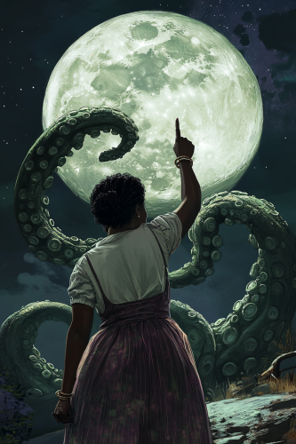 Photorealistic image of the front view of a short Caucasian white woman with dark hair wearing clothing befitting a captain standing on the deck of her sailing ship. Behind her, a giant tentacle rises from the ocean and is landing on the deck.