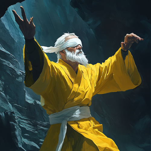 Mobile game cover, old man in yellow robe, white bandage covering his eyes, one arm stretched out, dark cavern background, digital painting, simple shapes, cartoon style, concept art in the style of Pixar, CGSociety, bold strokes, vibrant colors