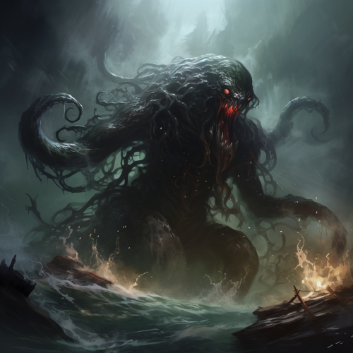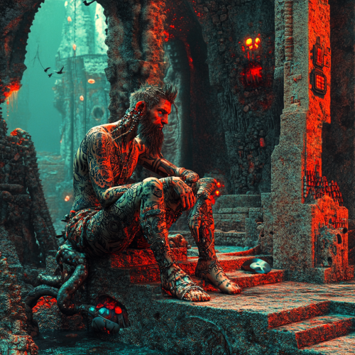 In the ruins of an underwater kingdom, there’s a handsome, rockabilly with tattoos, and tentacles for legs, cinematic, no people, 3D render blender, in a spectrum of vivid colors, and contrasting shadows, highly detailed, in ultra high resolution, black ink, heavy brushstrokes,
