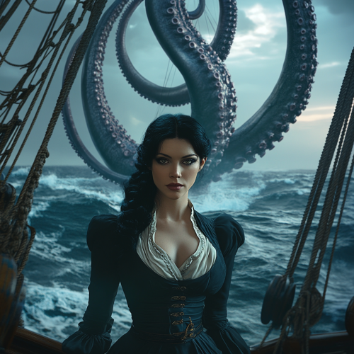 Photorealistic image of the front view of a short Caucasian white woman with dark hair wearing clothing befitting a captain standing on the deck of her sailing ship. Behind her, giant tentacle rises above the ocean and is landing on the deck.
