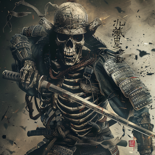 an evil skull samurai, with the skeleton rib cage and arm bones showing behind a broken samurai suit, semi realistic, chinese art style, dark, the samurai suit of armor also has cool patterns, the skull samurai is holding a sword with one hand and a bent arm covering its upper chest, perspective is at a slightly higher angle looking down at the skull samurai