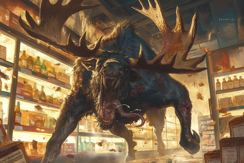 a large monstrous moose with sharp antlers crashing through a dark dilapidated grocery store + horror + art style of Capullo, Brom, Whelan, aly fell rutkowski, art germ, rossdraws, and franzzeta + art station + ultra detailed + hyper realistic + 8k --ar 3:2 --niji 6