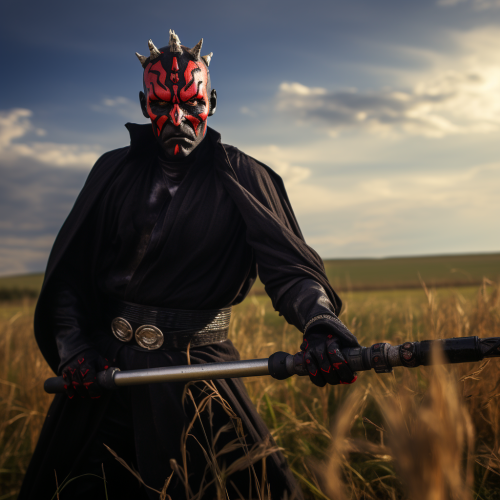 darth maul with a black moustache holding a lightsaber in a field ready for battle, High resolution dynamic action image AR 16:9