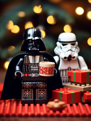 "Create an image of Darth Vader wearing a knitted ugly Christmas sweater decorated with festive patterns like snowflakes, Christmas trees, and reindeer, along with tiny, glowing lights embedded in the sweater. The lights should blink and add a colorful, playful effect that contrasts with Vader's dark, iconic look. Capture the humor in seeing the Sith Lord in a holiday-themed sweater that lights up, with intricate details on the knit texture and glowing lights. Set in a cozy holiday scene with warm lighting to highlight the unique blend of Vader’s serious demeanor and the whimsical sweater."