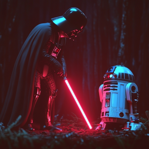 Darth Vader helm-less kneeling down in front of R2-D2. Darth Vader’s lightsaber is in his hand turning from red to blue. He feels nothing but sorrow. His scarred face is one of regret. R2-D2 is the only thing in the world giving him hope, redemption and forgiveness. Studio Ghibli animation.