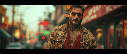 Dave Bautista in a flannel shirt jeans boots walking downtown LA with rayban sunglasses on with a shotgun, cinematic, dramatic lighting, photorealistic, moody, in the style of John Carpenter They Live, HDR, 8K, fine detail, --v 6.0 --ar 7:3 --s 750