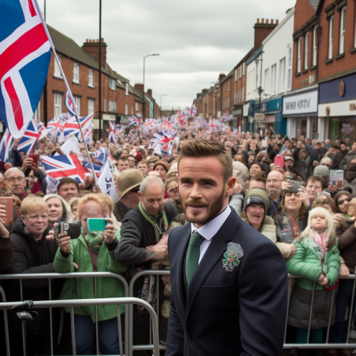 David Beckham is meeting the Queen and the Pope on the high street in Omagh, Northern Ireland. There is a large crowd. Wide angle shot showing hundreds of attendees.