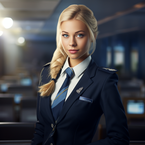 **In a high-end background a sophisticated ambiance, a flight attendant with her point finger at ther face doing the shhh sign and is surrounded by soft ambient lighting, she has her point finger doing the shhh sign