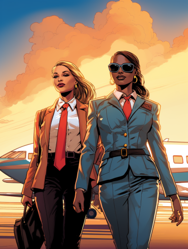 two flight attendants in an airport before takeoff, delta airlines, ultrawide shot, low angle, American comic style artwork, highly detailed, intricate detail, bold, dynamic, expressive, comic book cover, vibrant, Tones of Black, 8k --v 5.2 --ar 6:8
