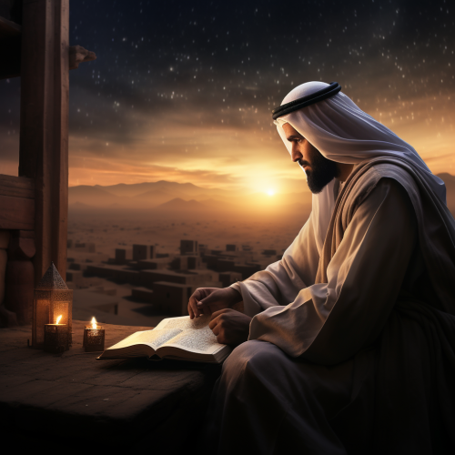 An Arab man far from his city writes a letter and looks at the sky Day lunar cycle, and he looks at his city and it is very, very far on the horizon, from night to morning and from morning to night, an hourglass that is coming to an end, you can barely see the city, the sun and the moon in the sky, isolation from home, during the reign of the last Umayyad caliphs in the year 127 AH