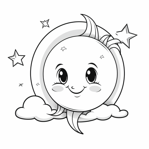 A friendly and smiling moon at dusk, illustration for a children coloring book for 2 years old kids, vector illustration, black and white, thick lines, white background