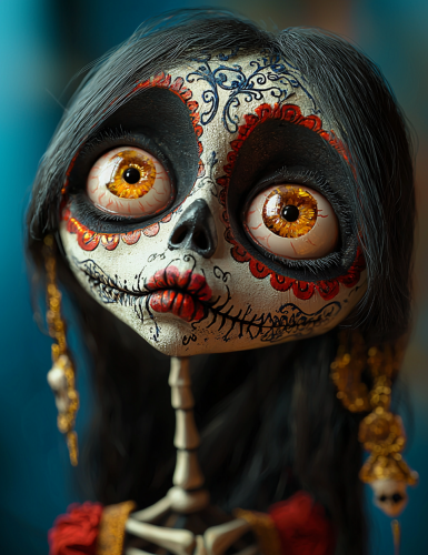 Day of the dead catrina, big eyes, long hair, red, gold, blue, black and white, intricate details, looking straight on, photorealistic, natural light, --ar 2588:3375 --q 2 --v 6.1
