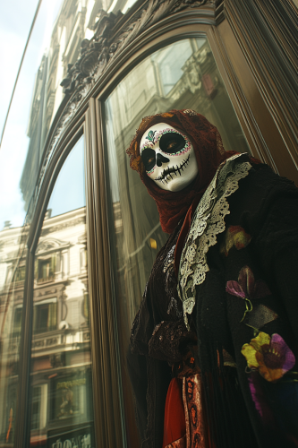 Es el dÃa de los muertos. Cientos de Personas disfrazadas de Halloween están entrando en un edificio en la calle gran via de Madrid. En primer plano una Catrina mexicana. Es de dÃa --ar 2:3