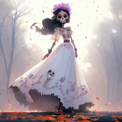 day of the dead art ilustration of female skull sitting in a throne, holding a staff in a lake garden of apple trees --ar 7:12