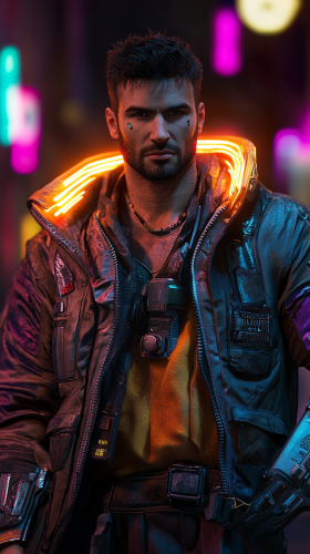 original character, sci-fi protagonist, badass, tough, tall, futuristic clothing, futuristic weapons, muscular, rugged, handsome, mature, full-body, dramatic lighting, neon lights --ar 9:16