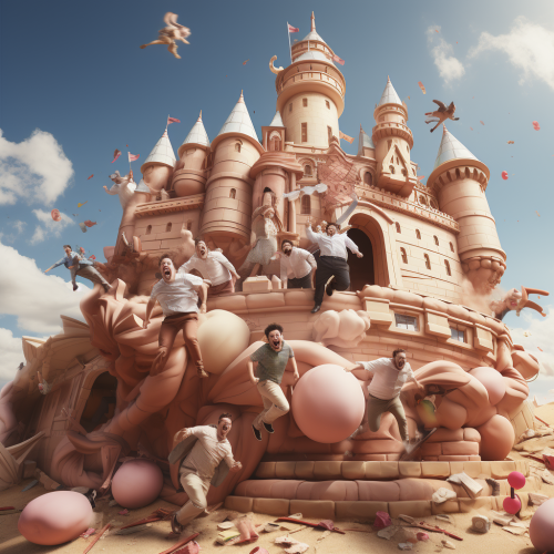 A majestic bear wearing a tattered red cape sits inside a cozy doghouse, holding a sandwich with focus, surrounded by swirling papers, glowing books, and floating musical notes. The background features flowing clocks, gears, and the soft glow of a sunrise, symbolizing a productive day of balance, work, and reflection. The scene radiates calm energy, with playful, surreal elements weaving throughout to represent creativity and daily routines --ar 16:9 --v 6.1 --style raw