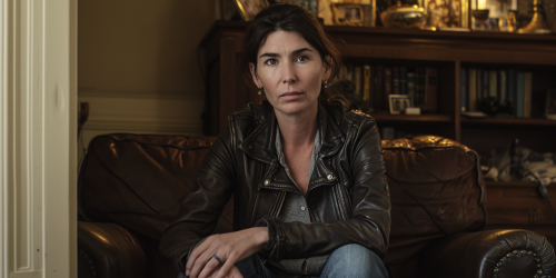 documentary interview shot of a woman in her early 40s, average looks, stylishly dressed in jeans and leather jacket, sitting center frame, looking at camera, cinematic still, filmed by [Steven Spielberg], 35mm, --ar 2:1 --v 6.0