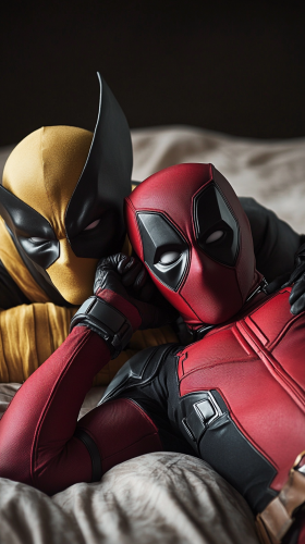 Imagine a scene where Deadpool and Wolverine, two iconic characters from the Marvel Universe, are playfully modeling in an unconventional setting--a cozy, large bed. Deadpool is at the front, lying down from right to left, striking a dramatic and cheeky pose as if he's modeling for a fashion shoot. He wears his signature red and black suit, and his head is propped up on one hand, giving the camera a mischievous wink. Behind him, Wolverine is lying from left to right, mirroring Deadpool's pose with a more serious expression, showcasing his rugged features and classic costume with the iconic three-clawed gloves. The background is minimal, focusing on the bed and a plain wall to not distract from the humorous juxtaposition of these two fierce warriors in a relaxed and amusing pose. 3d. --ar 9:16